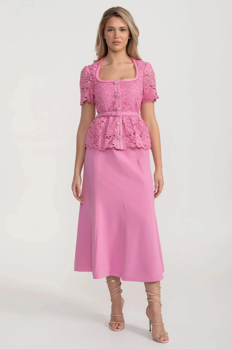 Pink Elegant Dress With Lace Top, Matching Belt And Coordinated Skirt