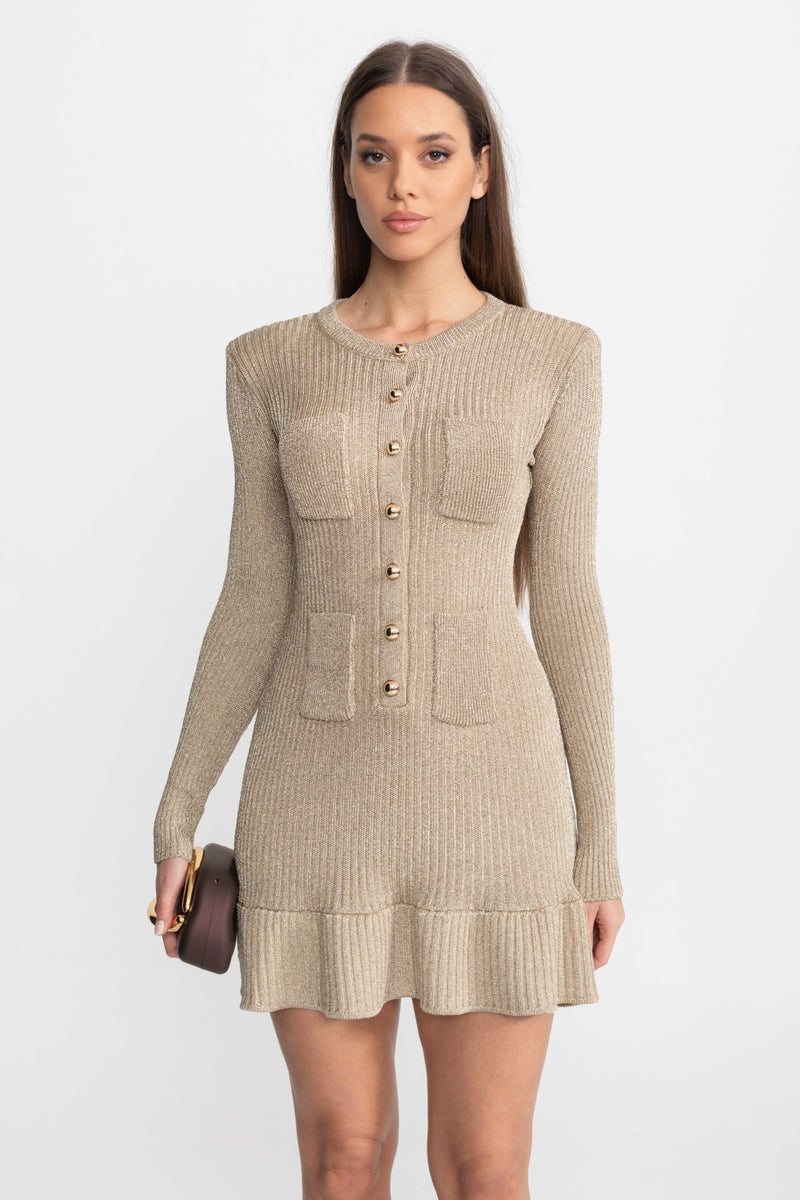 Shimmer Ribbed Knit Mini Dress with Gold Button Front