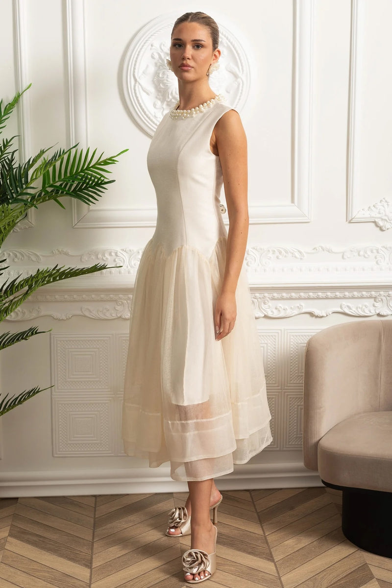 Ivoire Sleeveless Midi Dress with Tulle Skirt and Pearl Embellished Collar