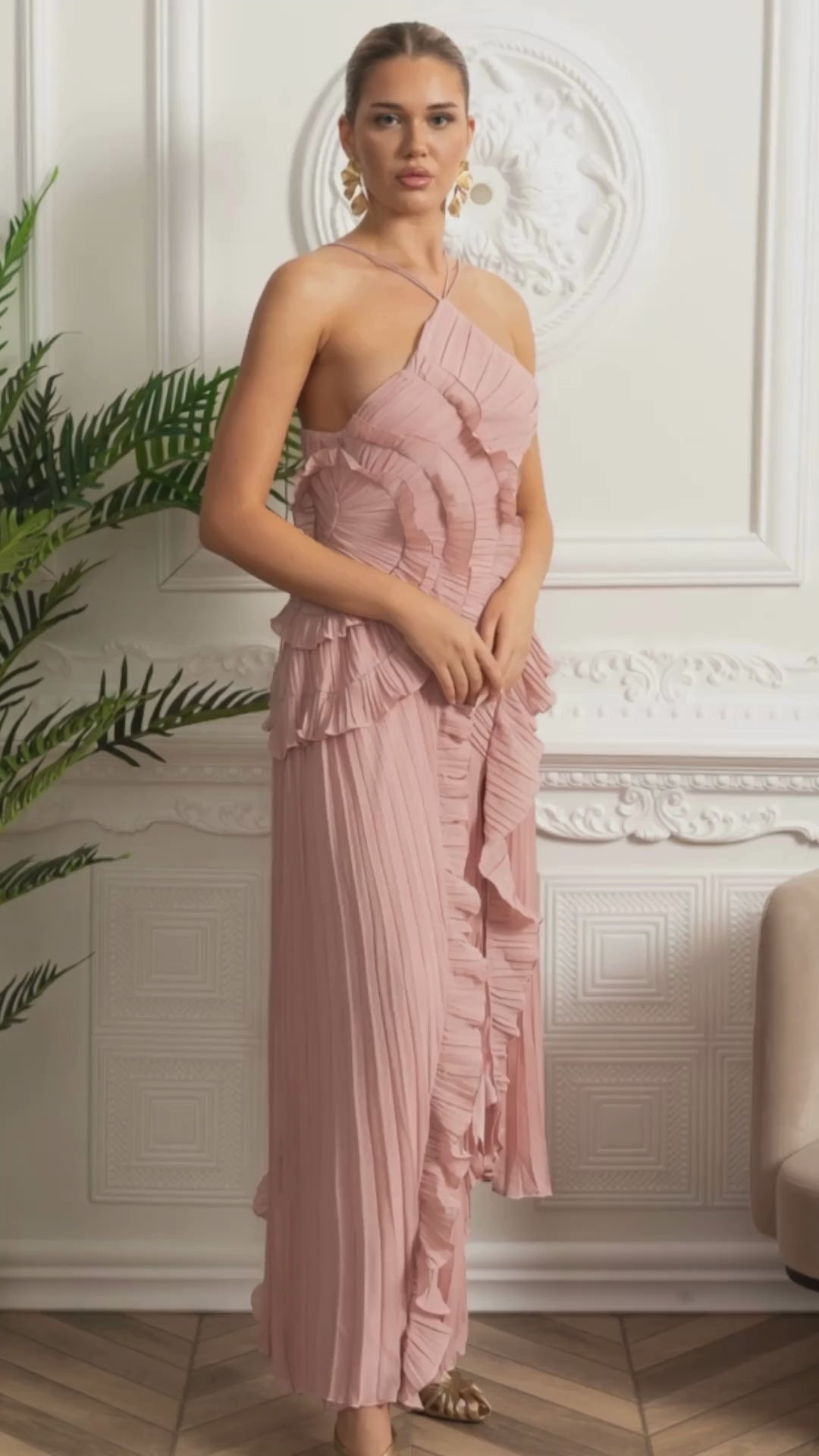 Robe midi plissée à col halter avec détails de volants en cascade - Rose